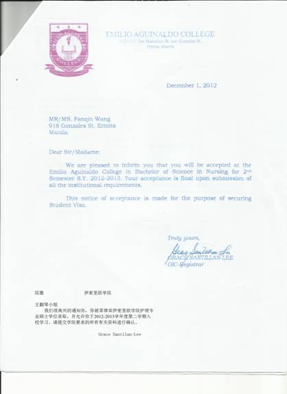 菲律宾伊密里欧公司入学通知书