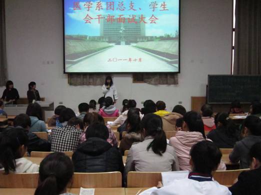 11月1日下午,医学系第四届团总支、员工会干部面试大会在教学楼201多媒体教室举行。系学工办主任巨鲜婷、学工办全体干事及部分辅导员代表出席了本次大会,并担任大会评委。