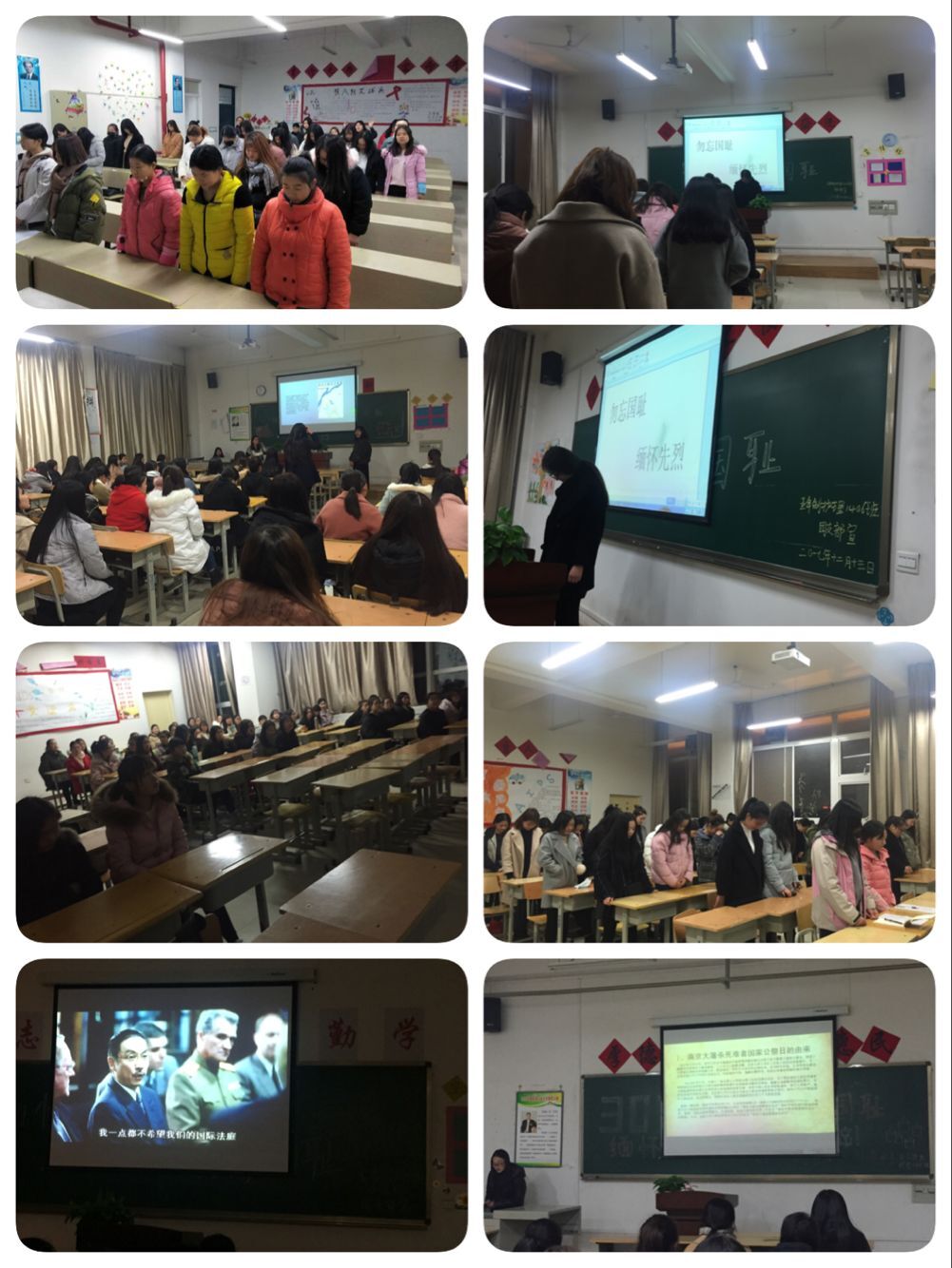 12月13日,团总支组织全院团员员工开展在朋友圈发文章或者图片的网络纪念活动;并以班级为单位举办以“缅怀逝者,铭记历史”为主题的南京大屠杀死难者国家公祭日主题团日活动,活动开始,全场静思默哀,缅怀逝者,接着还观看了相关历史记录影片,在历史的追溯中激发爱国热情,铭记历史的血泪。
