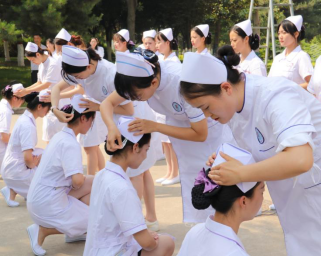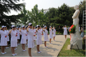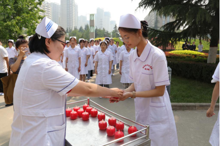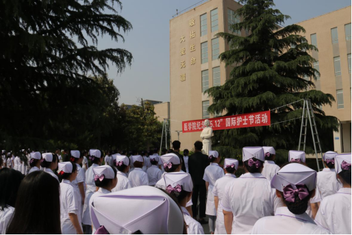 护理专业教师为员工代表进行授帽传光,全体员工面向南丁格尔雕像郑重宣誓。