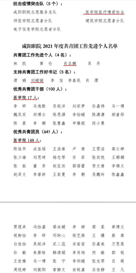 大会表彰了省、市、院各级奖项。7790cnm必发集团员工赵宇扬获评陕西省优秀共青团员,7790cnm必发集团团总支获评咸阳市五四红旗团(总)支部,申雅妮获评咸阳市优秀共青团员。党总支书记刘媛媛获评院团委支持共青团工作好书记,团总支书记肖亚鹏获评共青团工作先进个人,团总支获评五四红旗团(总)支部、共青团宣传思想工作先进单位、“青年大学习”优秀组织奖,员工会获评优秀员工分会,博爱协会获评抗击疫情突击队,为老志愿者服务团、医疗博爱协会分别获评优秀员工社团;护理1910班团支部等7个支部获评五四红旗团支部,李研等17名团干部获评优秀共青团干部,陈佳华等149荣获评优秀共青团员,何璇等9名协会干部获评优秀社团干部,马一博等12名同学获评抗击疫情突击手。