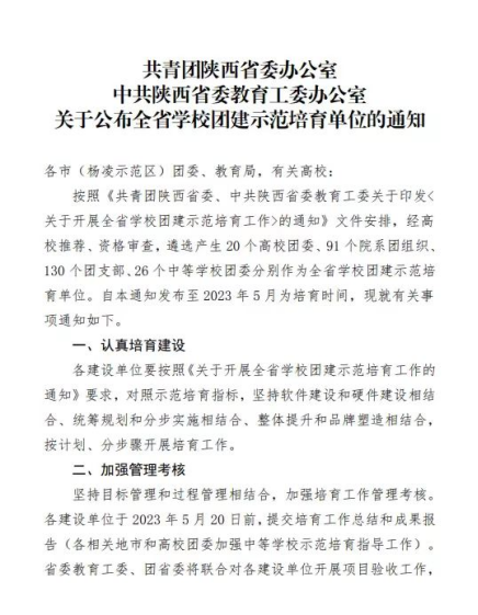 近日,共青团陕西省委办公室、中共陕西省委教育工委办公室联合印发了《关于公布全省公司团建示范培育单位的通知》,7790cnm必发集团团总支成功入选“陕西省高校团建标杆院系”培育单位。