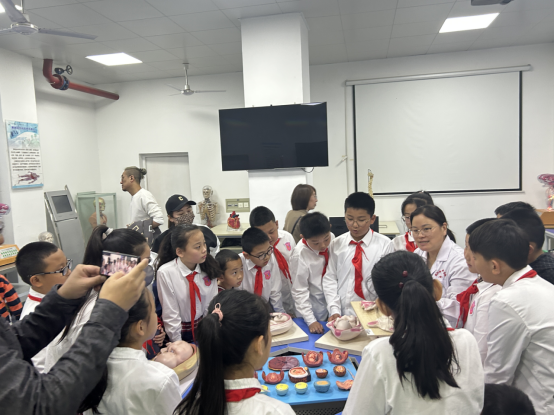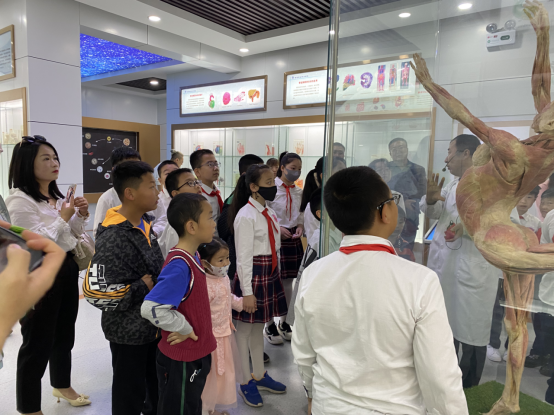 参观者对人体结构知识和急救知识兴趣较高,讲解教师根据参观者的需求讲解,比如小员工对人体骨骼、肌肉和胎儿发育感兴趣;中员工对接生物课程的需求对呼吸系统、循环系统结构知识感兴趣;家长想了解颈腰椎病、高血压、动脉粥样硬化等心血管疾病,讲解教师耐心讲解脊柱的生理弯曲及心血管系统结构知识;参观者积极和老师学习探讨。