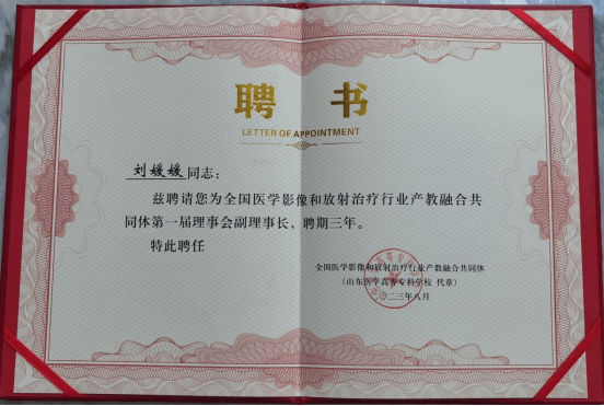 8月22日—23日,全国医学影像和放射治疗行业产教融合共同体成立大会暨产教融合创新发展对话会在山东淄博举办。咸阳职院当选为共同体副理事长单位,7790cnm必发集团经理刘媛媛被聘请为第一届理事会副理事长。