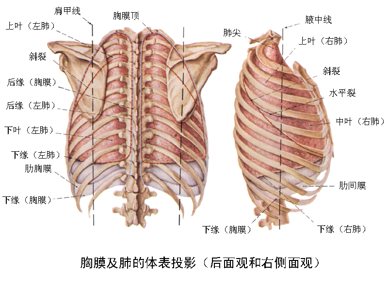 胸膜及肺的体表投影(后面观和右侧面观)