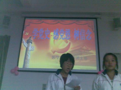 为庆祝建党90周年加强同学们的爱党,爱国意识,鼓励同学友好相处,奋发向上。1011班举行了形式新颖,内容生动的多媒体主题班会。辅导员陈萍及医学系部分团支书参加了此次班会。